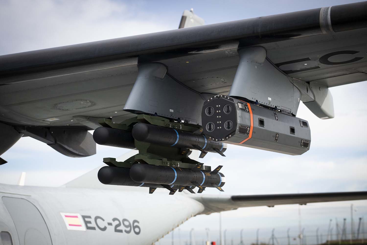 En las primeras pruebas aerodinámicas este C295 portaba ocho misiles guiados por láser y dos maquetas de bombas guiadas por láser.